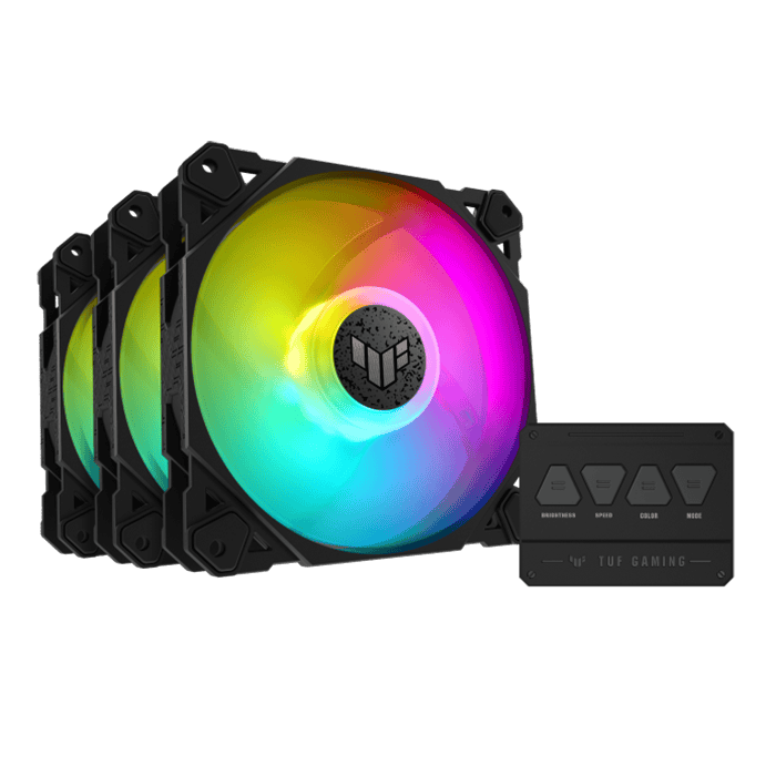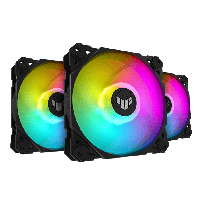 TUF Gaming TF120 ARGB system fans bring new layers of cool to your build. Each fan in this 3-pack features a high-luminance, double-layer LED array that pumps out deeply saturated colors against a backdrop of high airflow, low noise, and rugged durability, leaving the competition completely in the dark.